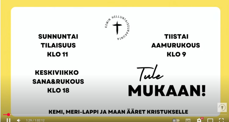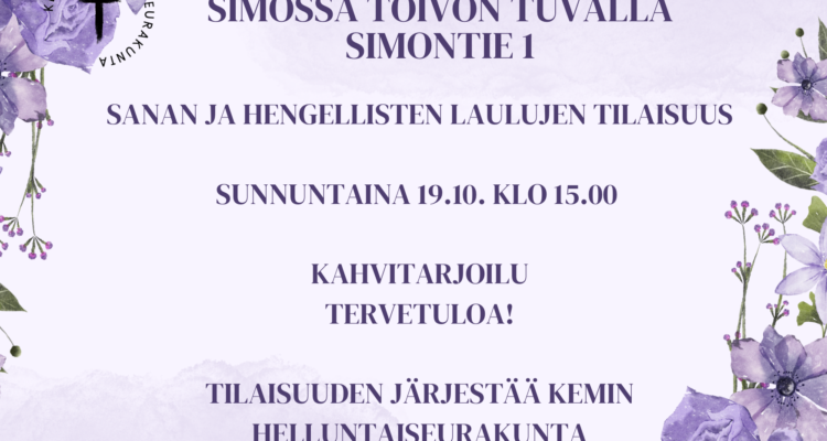 Seurakuntapäivä 26.10. klo 11.00-17.00 Ajoksessa Invalidiliiton maja, Toimintakeskus Koivuranta, Etappitie 41, 94900 Kemi Luvassa Jumalan Sanaa, rukousta, yhteislauluja ja leikkejä ja mielenkiitoisia keskusteluja. Tarjolla lounaaksi herkullista Ossin paellaa ja iltapäivällä välipalaa ja juomia. Osallistumismaksu 5 €/hlö tai 10 €/…